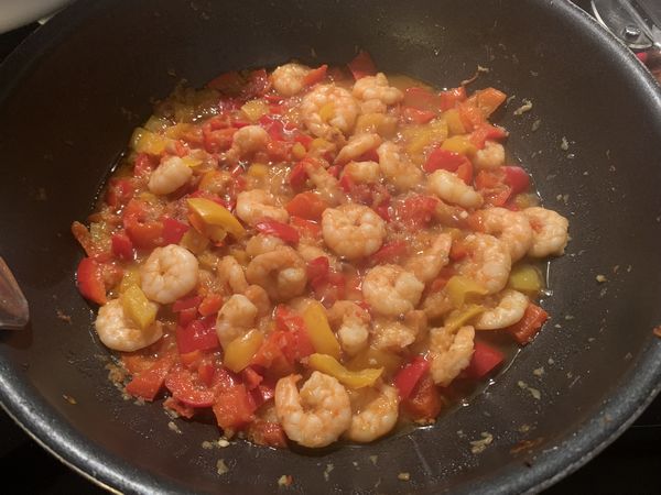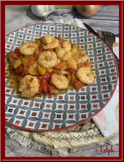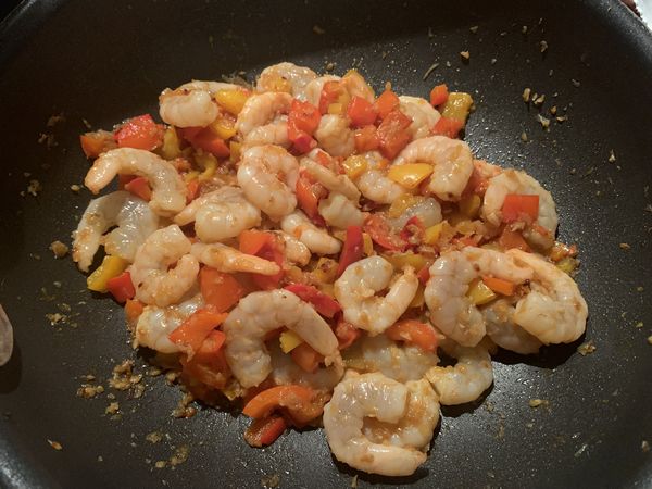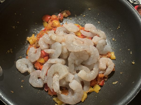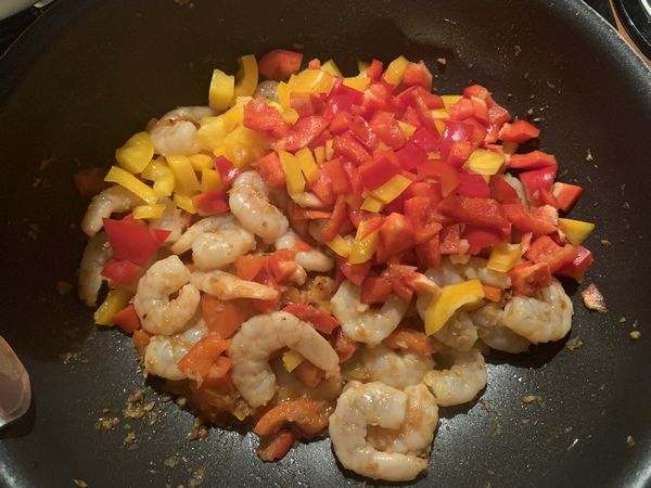 - Ajouter les crevettes et dès qu’elle deviennent oranges mettre le reste des poivrons, mélanger assaisonner à votre goût et laisser chauffer 10 minutes.