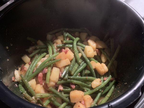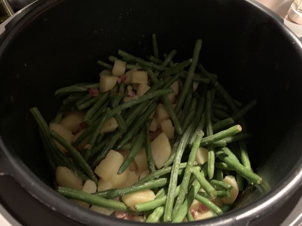 - Mettre votre Cookéo en mode dorer puis mettre vos gousses d’ail, l’échalote et les lardons mélanger et laisser dorer 1 minute, ajouter les pommes de terre, et laisser dorer 6 minutes, mélanger régulièrement.