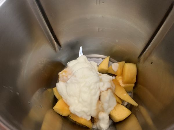 - Mettre dans le bol du Thermomix, les morceaux de mangue avec le jus de citron, le yaourt, le sirop d’érable et mixer 10sec/vit6.