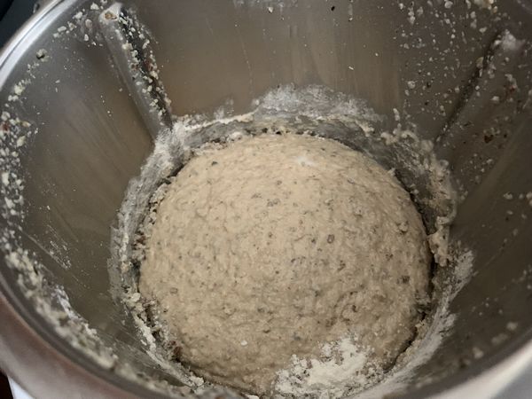 - Ajouter les farines, le bicarbonate et le sel, mettre en mode pétrin pour 2 minutes, la pâte est collante c’est normal.