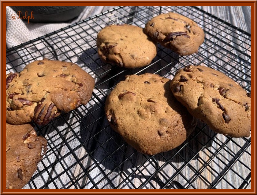 J’avais déjà testé les cookies aux jaunes d’oeufs que nous avions beaucoup aimés grignoter je les ai rendus plus gourmands en ajoutant des noix de pécan et des pépites de chocolat. En même temps, cela me permet d’écouler mes deux jaunes d’oeufs qui se retrouvaient seuls après la confection d’une dacquoise, une belle recette anti-gaspi.