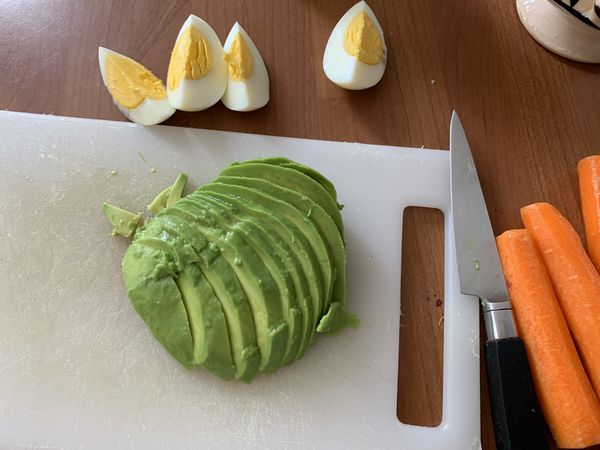 - Couper votre avocat en fines tranches, mettre un peu de jus de citron dessus pour éviter qu’il ne noircisse.