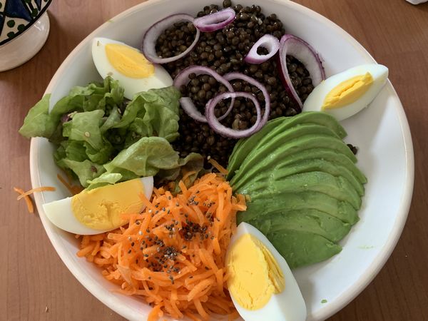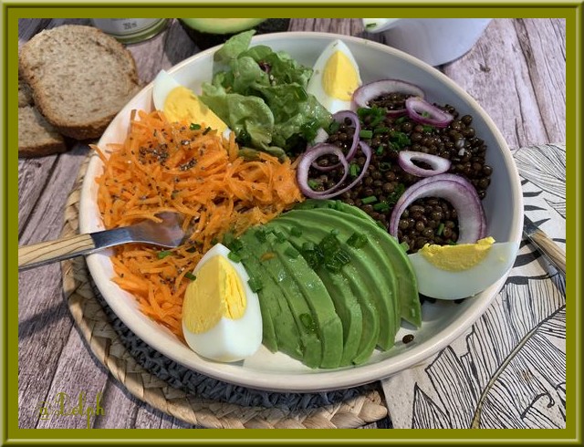 - Disposer vos lentilles, mettre à côté quelques feuilles de salade, puis les carottes et l’avocat, répartir l’oeuf. Puis mettre quelques rondelles d’oignon sur les lentilles, parsemer des graines de chia sur les carottes.