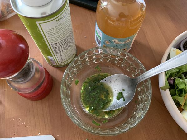- Préparer votre vinaigrette en émulsionnant le vinaigre et l’huile, assaisonner puis mettre votre ciboulette ciselée.