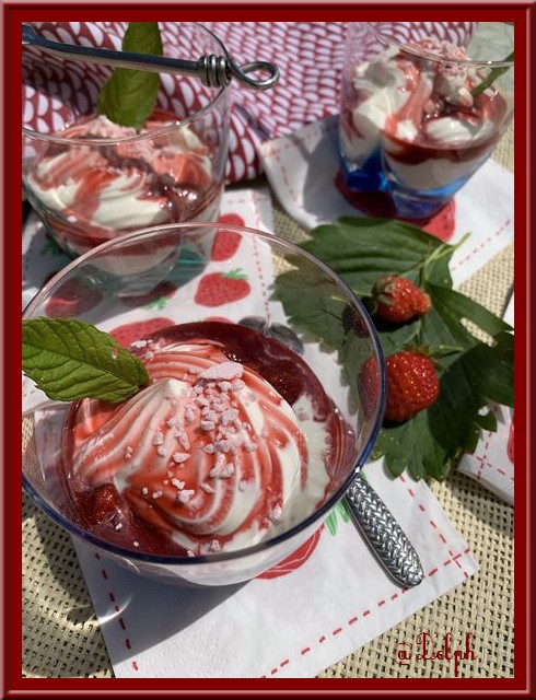 - Répartir une partie de la crème dans 4 verrines déposer les fraises cuites, finir par une nouvelle couche de crème puis verser le reste de coulis sur le dessus.