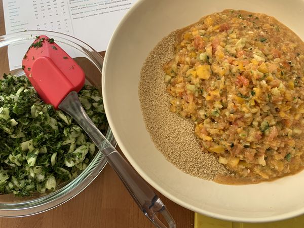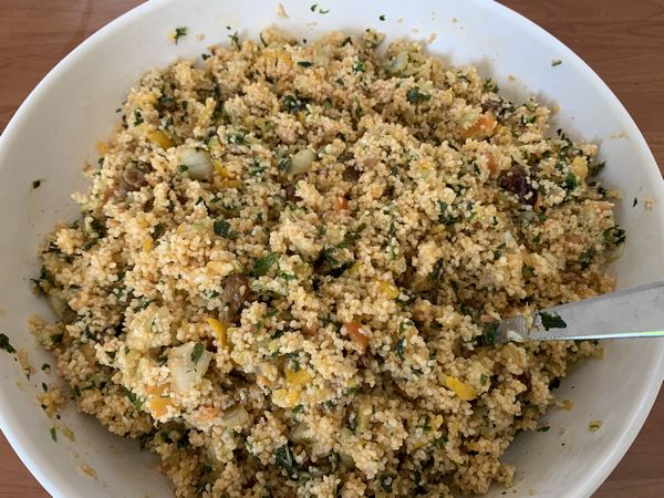 - Mettre votre semoule dans un saladier, verser le contenu du bol sur la semoule, mélanger ajouter les herbes et l’oignon hachés puis les raisins, bien mélanger le tout.