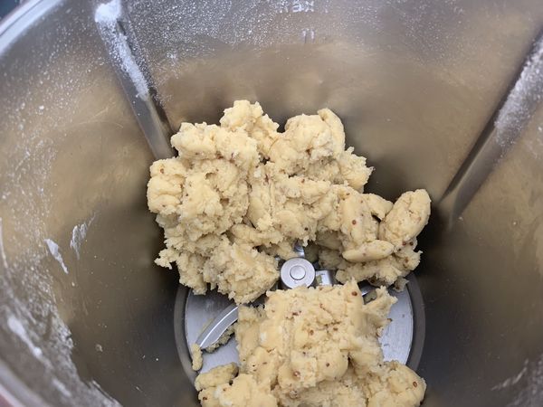 - Mettre le beurre coupé en morceaux et la farine dans le bol et mélanger 10 sec/vit5, ajouter l’œuf battu, l’emmental, la moutarde et le poivre puis mettre en mode pétrin pour 1 minute.