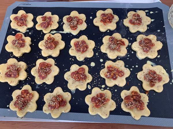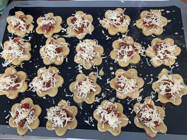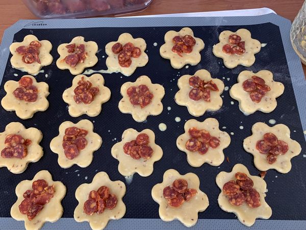 - Répartir les fines lamelles de chorizo sur les sablés, saupoudrer avec les 20 g d’emmental et d’une pincée d’origan séché et enfourner pour 15 minutes.