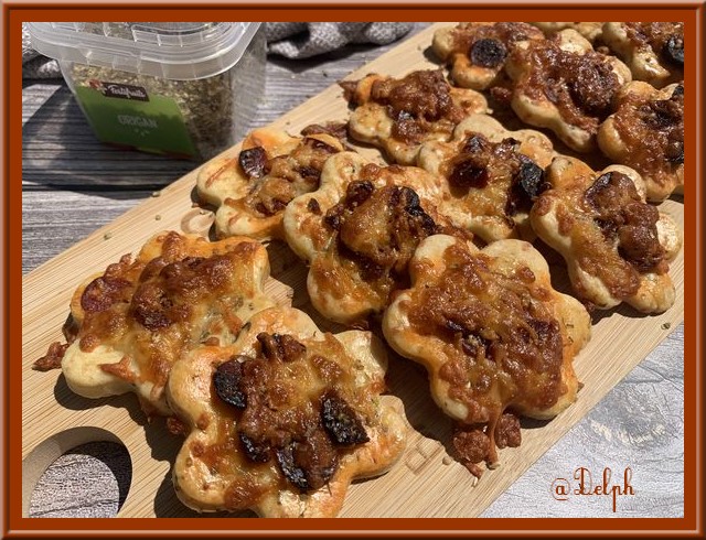 - Répartir les fines lamelles de chorizo sur les sablés, saupoudrer avec les 20 g d’emmental et d’une pincée d’origan séché et enfourner pour 15 minutes.