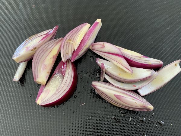 - Dans un cul-de-poule, enrober l’oignon coupé en quartiers de 2 cm de large dans une cuillère à soupe d’huile d’olive et 1 pincée de sel.