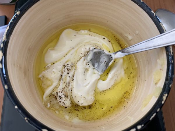 - Mélanger tous les ingrédients dans un bol avec 1 pincée de sel et du poivre, réserver.
