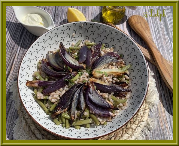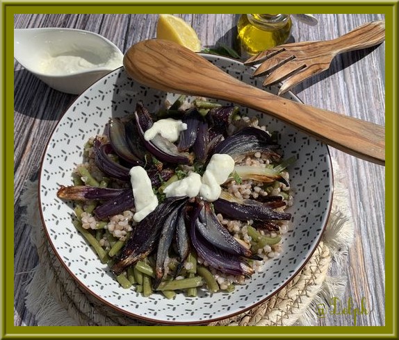 - Au moment de servir mélanger les haricots et le sarrasin, disposer les oignons sur le dessus, ciseler la menthe.