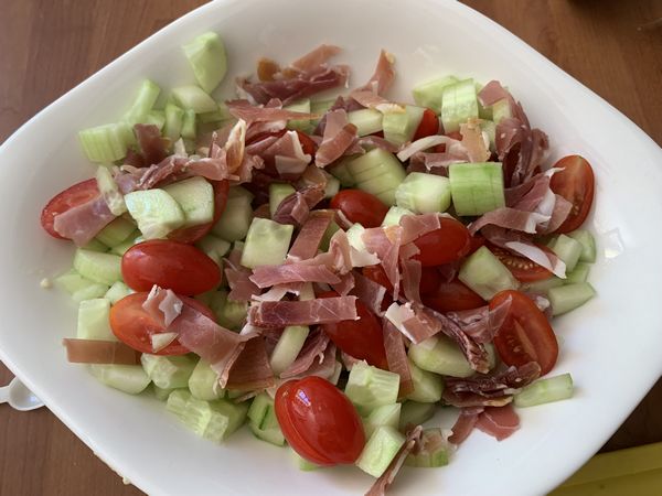 - A l’aide d’un économe, faire des copeaux de parmesan, puis couper le jambon en lardons.