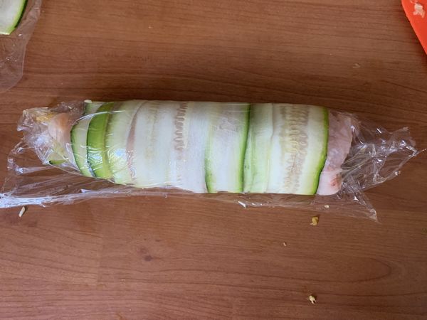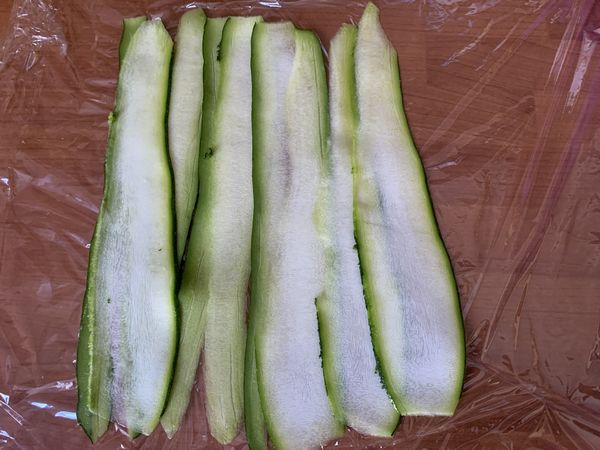 - Faire des tagliatelles de courgette à l’aide de votre économe, les disposer sur un carré de film alimentaire.