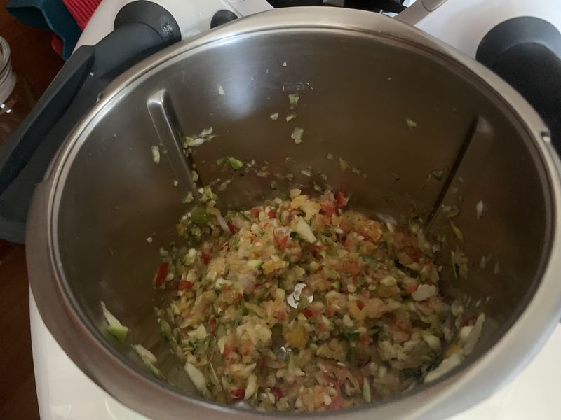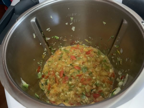 - Laver et éplucher les poivrons, les couper en quartiers, éplucher l’oignon et le couper en deux, éplucher la gousse d’ail, mettre le tout dans le bol avec le reste de la courgette et mixer 5 sec/vit 5, racler les bords du bol à l’aide de la spatule.