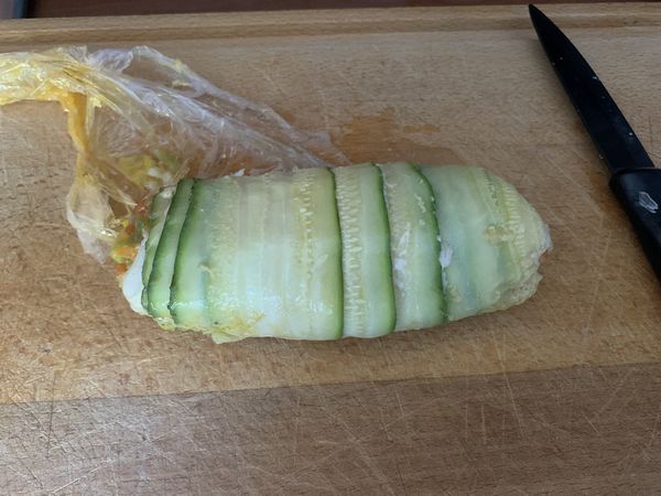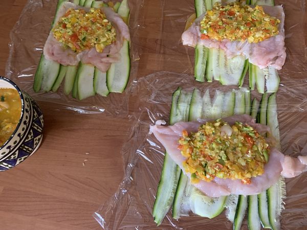 - Lorsque la farce est prête; la disposer sur vos filets de poulet (enlever l’eau rendue des poivrons à l’aide d’un écumoire), enrouler le film alimentaire tout en le maintenant bien serré, et fermer les bords .