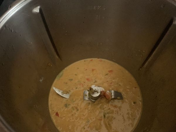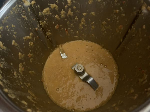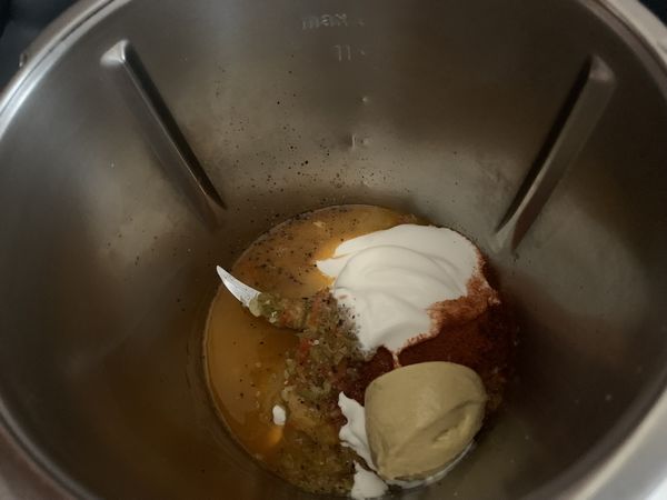 - Dans le bol du Thermomix remettre le reste de la farce réservée, ajouter la crème fraîche, la moutarde et le reste de paprika, faire chauffer 3min/115°c/Vit 2 sans le gobelet puis mixer 10 s/Vit16 pour obtenir votre sauce.