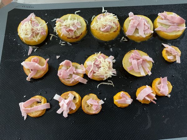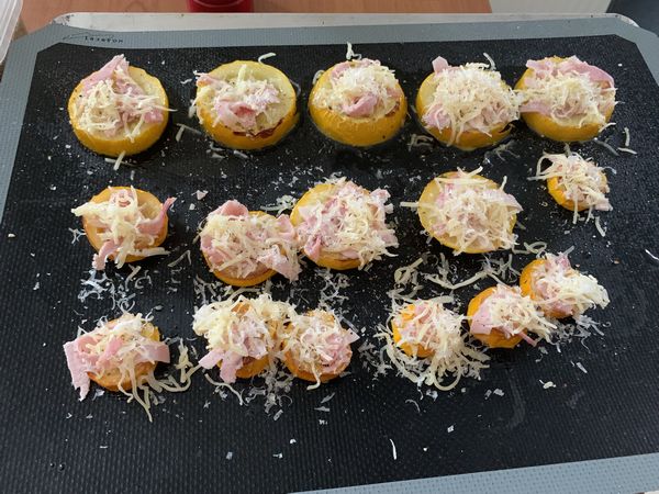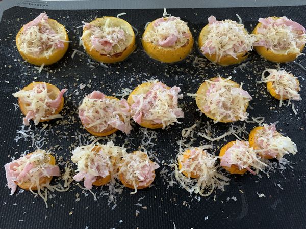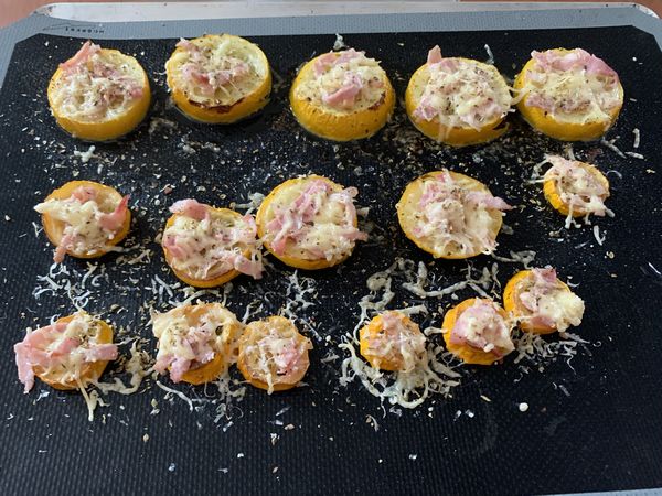 - sortir votre plaque puis déposer sur chaque rondelles, un peu de jambon, recouvrir d’un peu de gruyère, puis de parmesan râpé, assaisonner et parsemer d’origan.