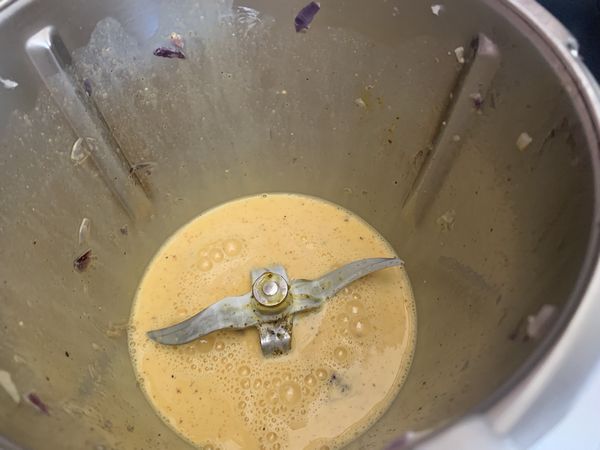 - Inutile de rincer le bol, mettre la crème, les œufs assaisonner avec le piment, le sel, le poivre, puis mélanger 30 sec/vit3, ajouter le mélange oignons et piment puis mélanger 20sec/couteau inversé/vit2, incorporer le fromage râpé, mélanger avec la spatule.