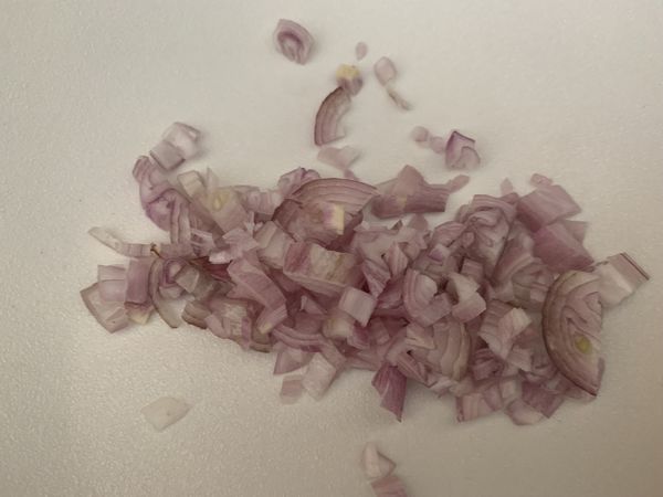 - Éplucher et ciseler votre échalote. Laver vos tomates cerises et les couper en deux.