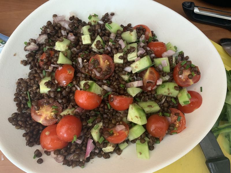 J’aime beaucoup les lentilles froides et en salade elles sont parfaites. Vous pouvez retrouver sur le blog plusieurs salades à base de lentilles notamment le buddha bowl avec des carottes et avocat, avec des tomates, thon et radis, le bowl au chou rouge et sardines. Ici j’ai à nouveau pris la variété Beluga, qui a un bon petit goût de noisette que j’apprécie beaucoup. Je les ai associées à du concombre et à de bonnes tomates cerises qui viennent du potager. C’est du tout simple pour se régaler sainement.