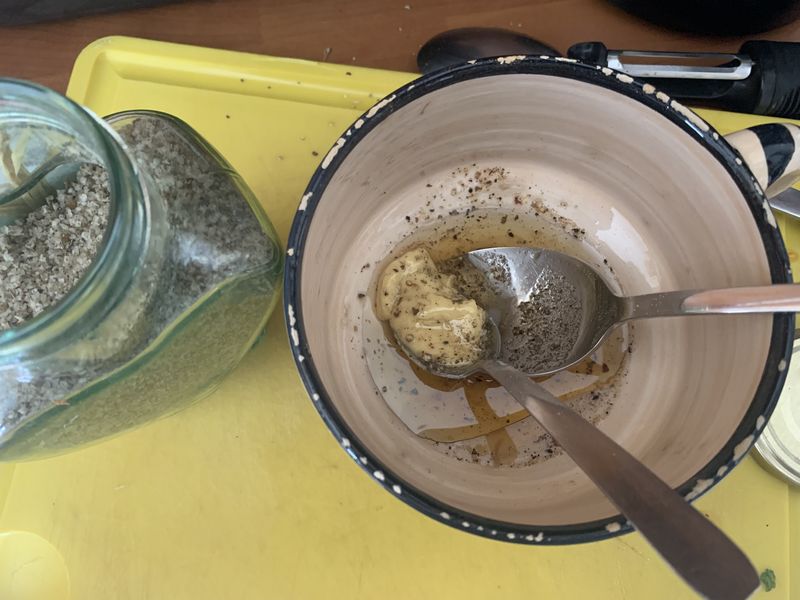- Préparer votre vinaigrette en émulsionnant la vinaigrette et l’huile, ajouter la moutarde, le sel et le poivre.