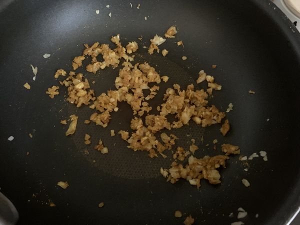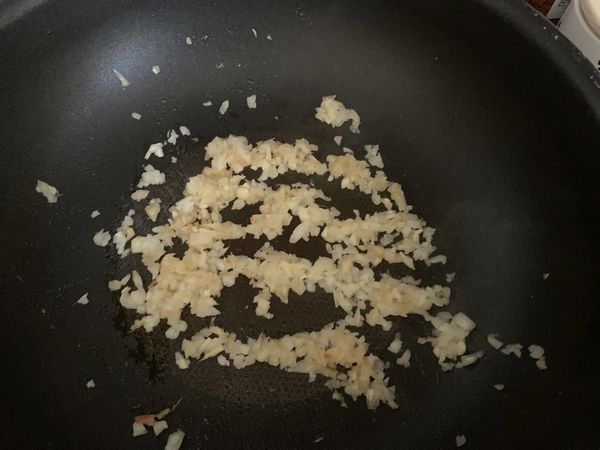 4. Si besoin, ajouter de l’huile de coco dans la poêle et y faire revenir l’oignon et l’ail émincés avec le gingembre.