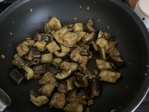 2. Mettre l’huile de coco dans une poêle et ajouter les morceaux d’aubergine, les faire cuire à couvert une vingtaine de minutes sur feu moyen, ajouter 2 c à s d’eau pour éviter qu’elles n’accrochent..