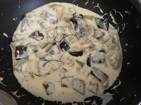 5. Une fois qu’ils sont translucides, ajouter le curry et les aubergines. Verser le lait de coco et assaisonner avec le sel et le poivre. Laisser mijoter 15 minutes sur feu doux à couvert.