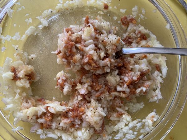 - Retirer le boyau de la merguez, la couper en morceaux et la mélanger avec la chaire de la courgette et l’échalote. Saler et poivrer.