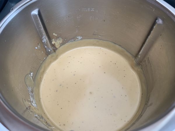 - Dans le bol du Thermomix mettre la farine, les sucres, la levure et mélanger 30 sec/vit3. Ajouter les œufs, la crème et le beurre fondu, mélanger 30 sec/vit4, racler les bords, mélanger 30sec/vit3.