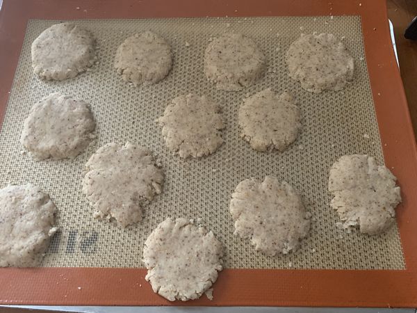 - Réaliser des petites boules de taille identique et les aplatir avec la paume de la main. Déposer au fur et à mesure sur la plaque.
