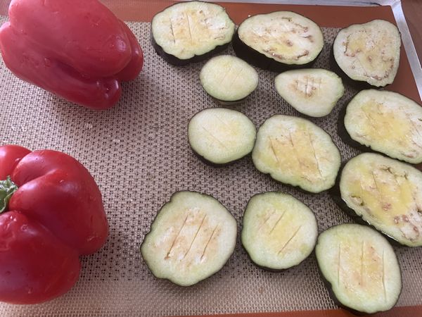 - Détailler votre aubergine en fines rondelles, les placer sur une toile silpat, faire des petites entailles, puis verser un peu d’huile d’olive, la faire pénétrer dans les rondelles d’aubergine avec un pinceau, mettre à côté vos poivrons entiers lavés.