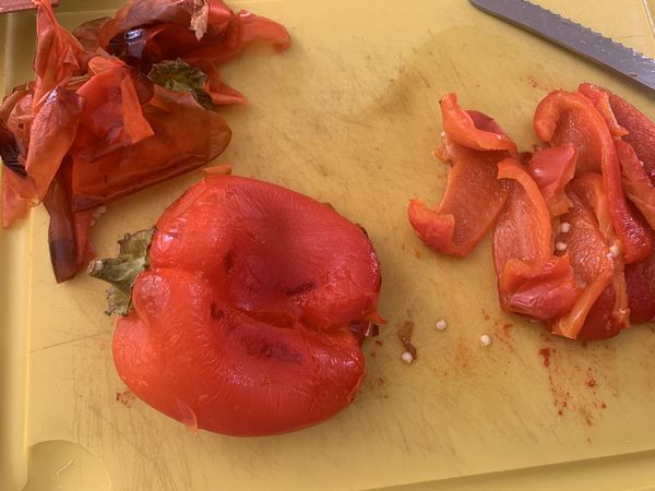 - Retirer la peau des poivrons, sans vous brûler, couper les poivrons en deux, retirer la queue et les épépiner.
