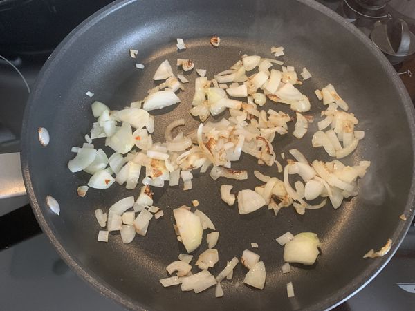 - Pendant ce temps, faire chauffer dans une poêle, une cuillère à soupe d’huile d’olive, puis faire revenir l’oignon épluché et ciselé.