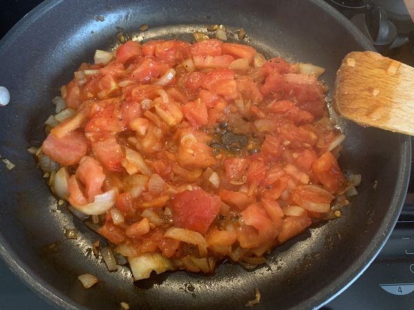 - Émonder vos tomates puis les détailler en petits dés, les ajouter dans la poêle, assaisonner.