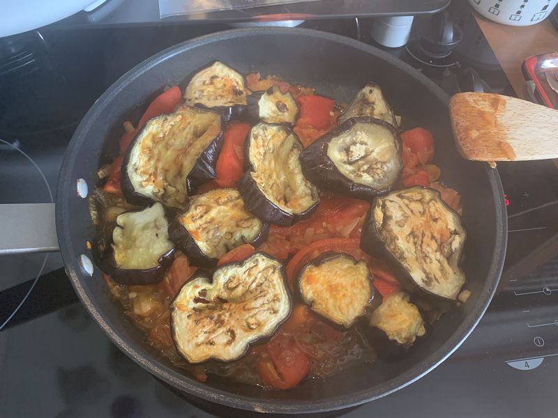 - Découper les poivrons en lamelles, les ajouter sur les tomates, mélanger, puis mettre sur le dessus les rondelles d’aubergine, couvrir avec un couvercle, puis laisser sur feu doux environ 15 minutes.