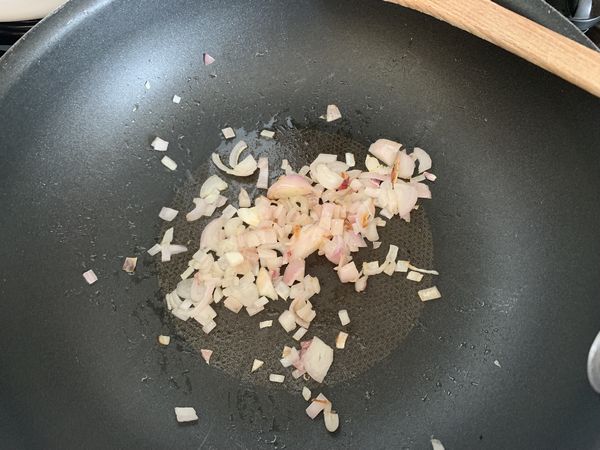 - Dans une sauteuse, faire chauffer de l’huile d’olive et faire revenir l’échalote.