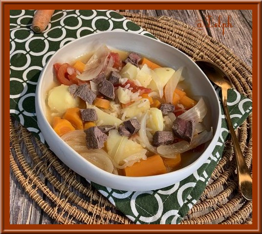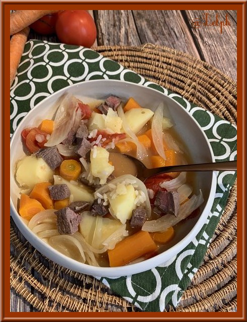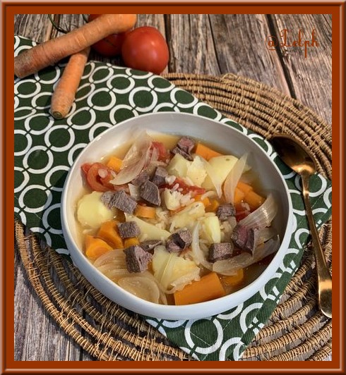 Cette soupe vient du Turkménistan, c’est une soupe qui n’est pas moulinée. Elle est réalisée avec un bouillon de bœuf que l’on cuit au préalable. J’ai pour habitude de manger mes soupes mixées, et bien je me suis régalée car nous sentons bien chaque saveur de tous les légumes, elle est très réconfortante. J’ai utilisé mon Thermomix, mais vous ferez pareil en cocotte. C’est une nouvelle recette pour ma chère Sophie et son association « Cuisiner pour la paix ».