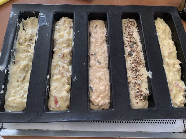 - Puis mélanger une part avec les ingrédients du cake 1, verser dans votre première empreinte, faire de même avec les 4 autres.