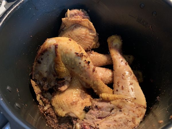 - Ajouter le bouillon, puis baisser le feu et passer en mode sous pression pour 18 minutes. Sortir le poulet, le réserver au chaud, réserver le jus de cuisson. Inutile de rincer la cuve.