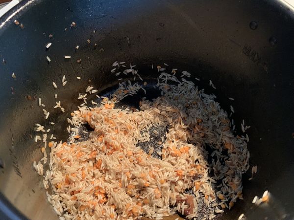 - Faire chauffer l’huile dans la cuve en mode dorer, y faire revenir brièvement le riz et les lentilles en mélangeant environ 1 minute. Ajouter le jus de cuisson réservé, couvrir le riz avec le bouillon jusqu’à 1 cm au dessus du riz et des lentilles, porter à ébullition, baisser le couvercle du Cookéo puis passer en mode maintien au chaud pour 15 minutes