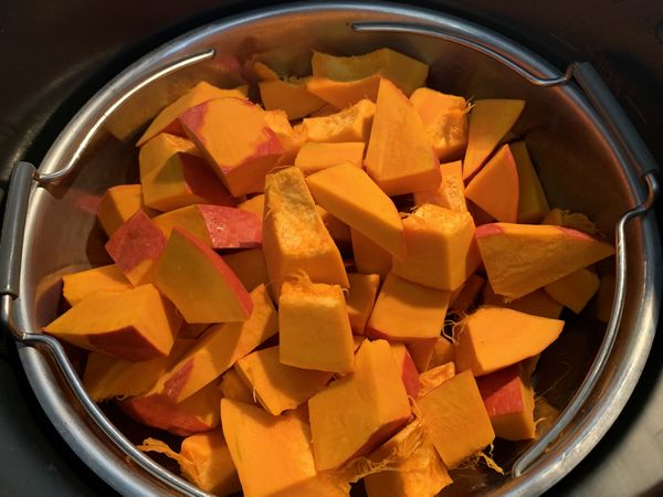 - Le couper en cubes puis le mettre dans le cuit vapeur de votre cocotte et le faire cuire 10 minutes à partir du chuchotement de la soupape.