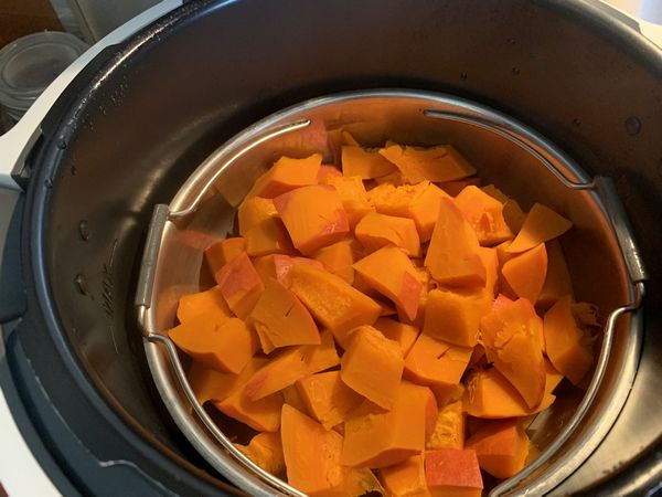 - Le couper en cubes puis le mettre dans le panier vapeur, installer le trépied dans la cuve du Cookéo, puis mettre de l’eau à sa hauteur, installer le panier vapeur puis lancer le mode sous pression pour 8 minutes.