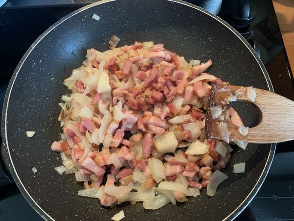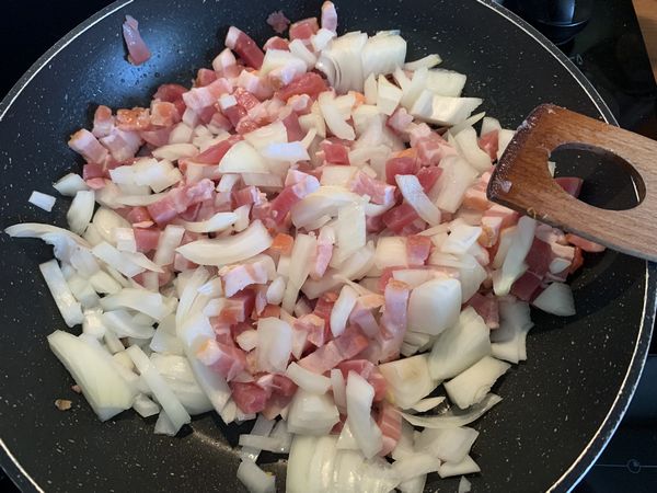 - Éplucher et émincer l’oignon, le faire revenir dans une sauteuse avec les lardons, lorsque tout est bien doré.