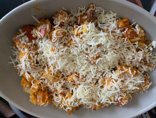 - Mélanger bien le tout puis verser dans un plat allant au four.