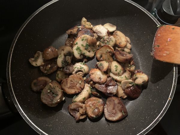 - Faire chauffer dans une poêle un filet d’huile d’olive, y ajouter les champignons nettoyés, et coupés en lanières et les châtaignes coupés en deux; faire revenir le tout environ 5 minutes.