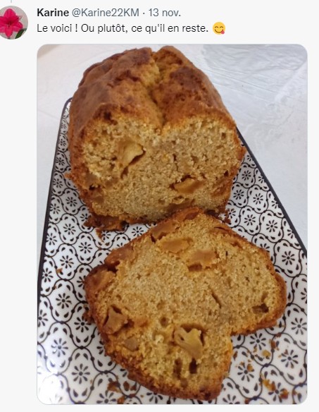 Karine qui me suit sur Twitter a eu la gentillesse de tester le cake aux pommes caramélisées