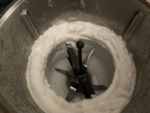 - Mettre les blancs dans le bol du Thermomix puis donner 1 coup de turbo, ajouter une pincée de sel, insérer le fouet puis programmer 3 min/vit3,5 sans le gobelet, au bout de 1 min30, verser en pluie 50 grammes de sucre par le trou du gobelet. Réserver et enlever le fouet. Inutile de rincer le bol.