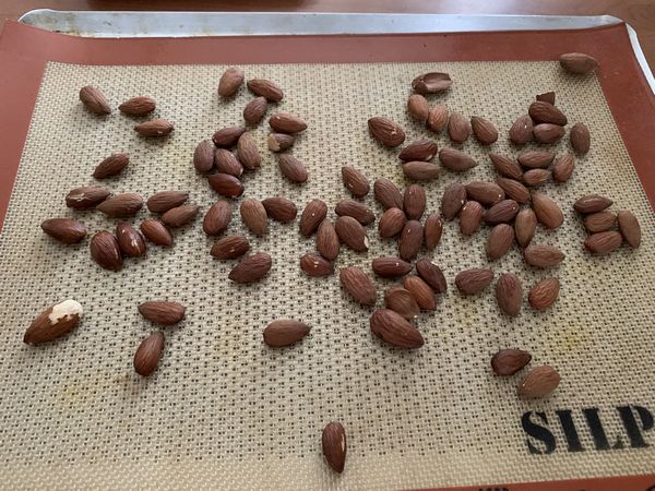 - Placer votre toile de cuisson sur votre plaque alu, répartir les amandes entières dessus et les faire torréfier 10 minutes. Les hacher (sans mes mettre en poudre), puis les réserver.